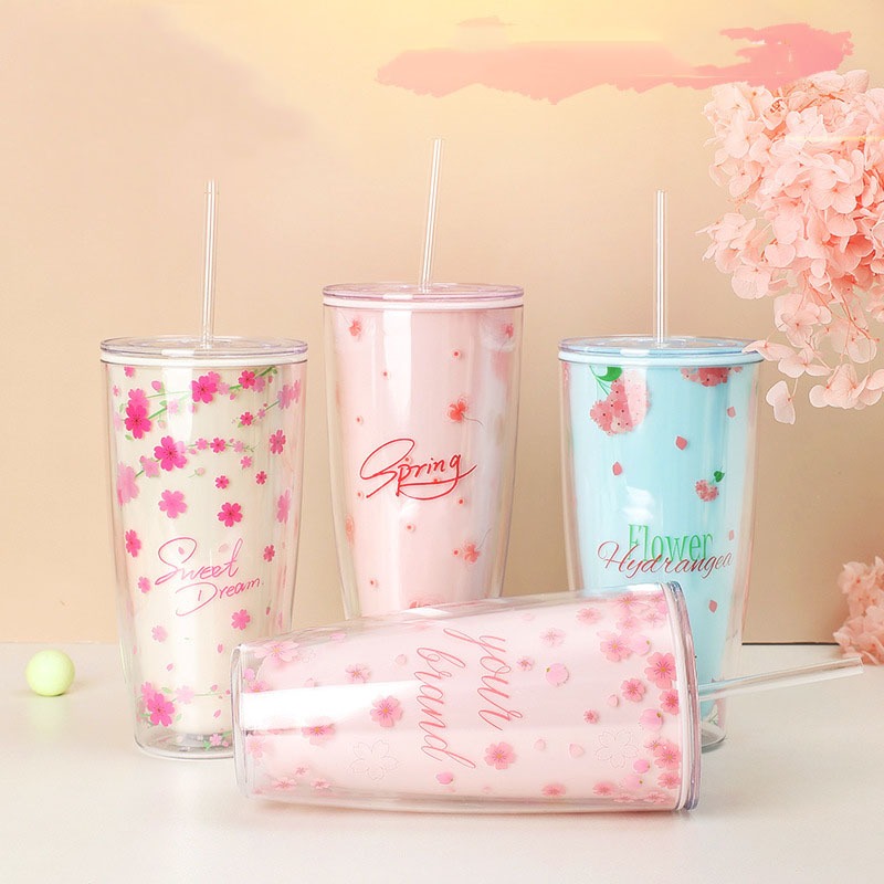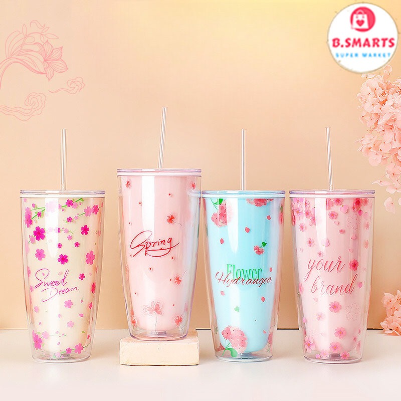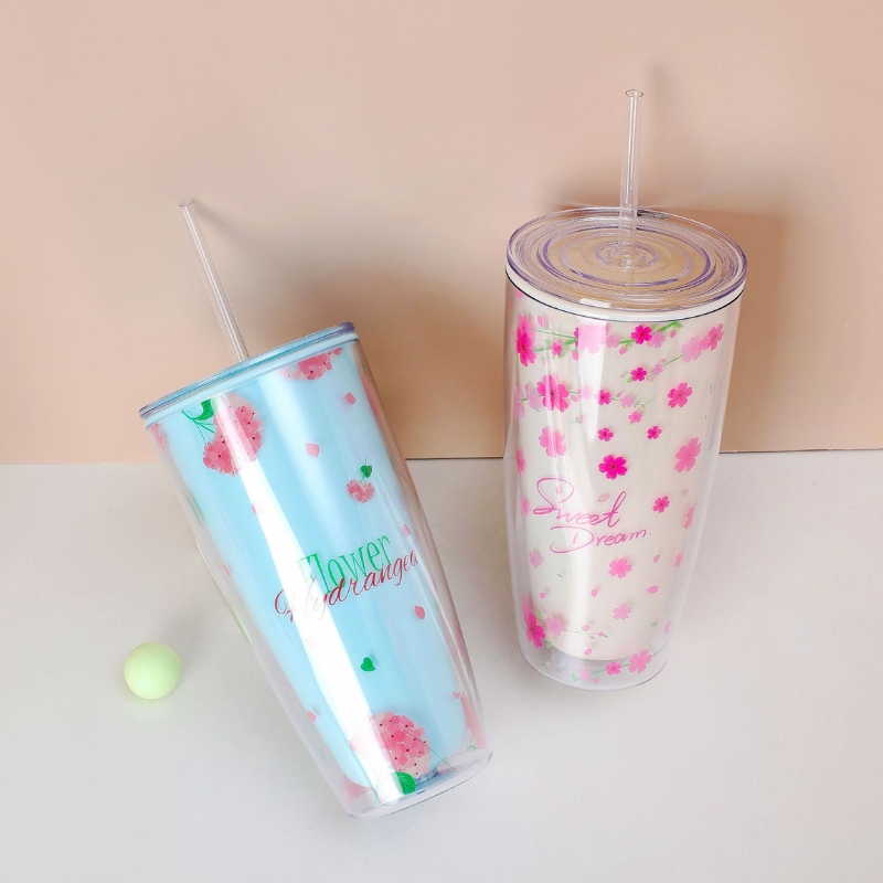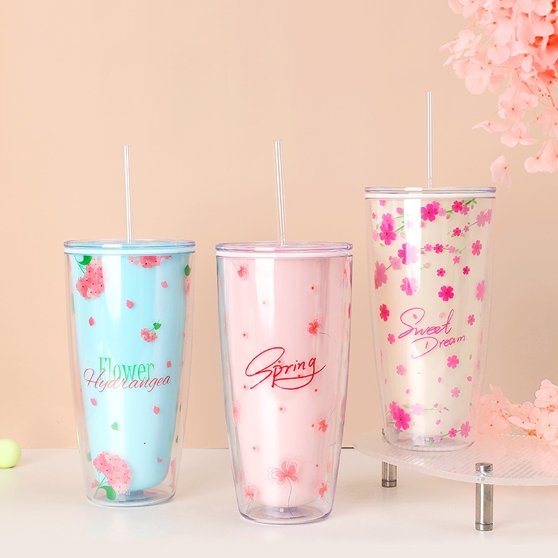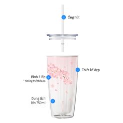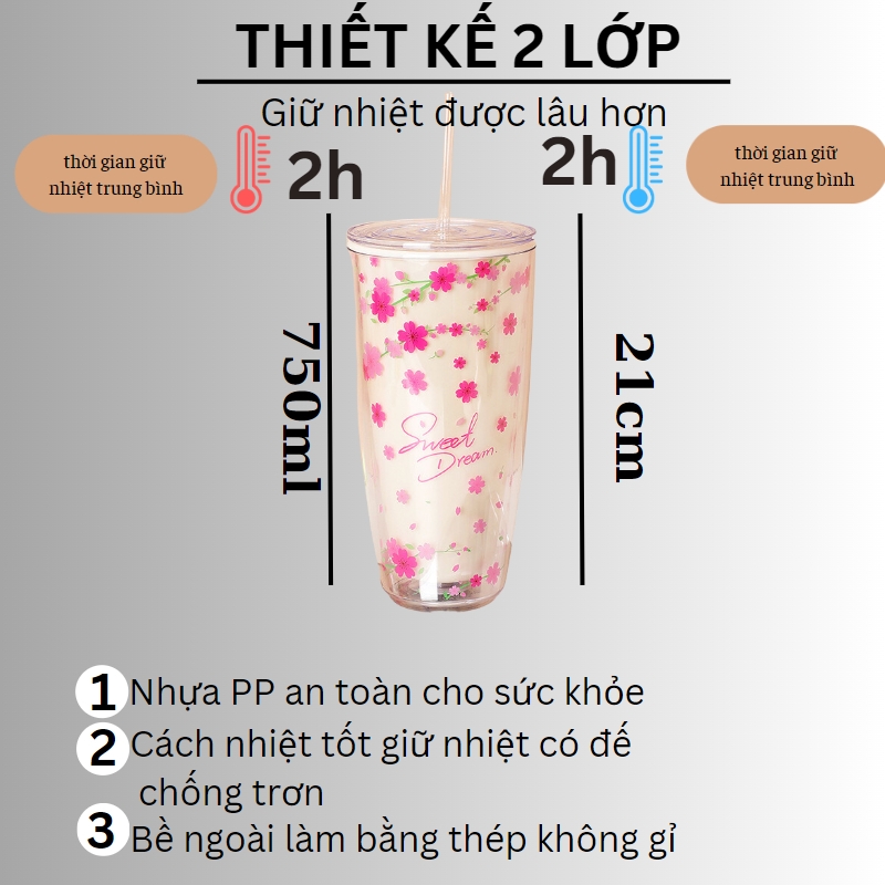 Cốc giữ nhiệt có nắp kèm ống hút 750ml họa tiết xinh xắn, Ly nhựa chịu nhiệt không đổ mồ hôi an toàn sức khỏe