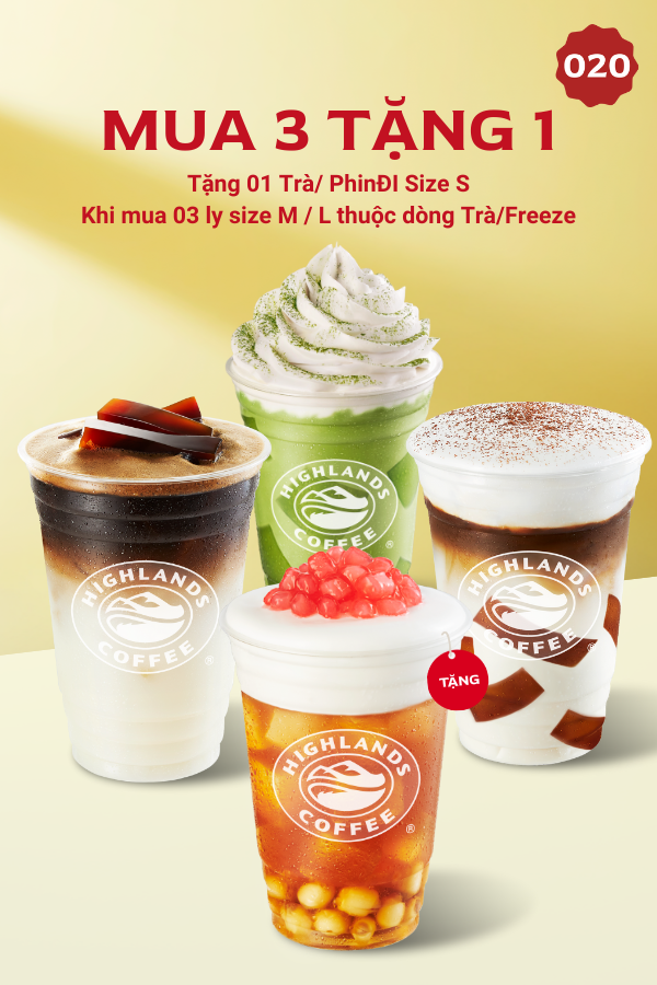 Highlands Coffee mang đến chương trình Mua 3 Tặng 1 cực kỳ hấp dẫn. Khi mua 03 ly cỡ vừa hoặc lớn, bạn sẽ được tặng ngay 01 ly bất kỳ cỡ nhỏ miễn phí. Đây là cơ hội tuyệt vời để cùng bạn bè thưởng thức hương vị trà và cà phê yêu thích.
